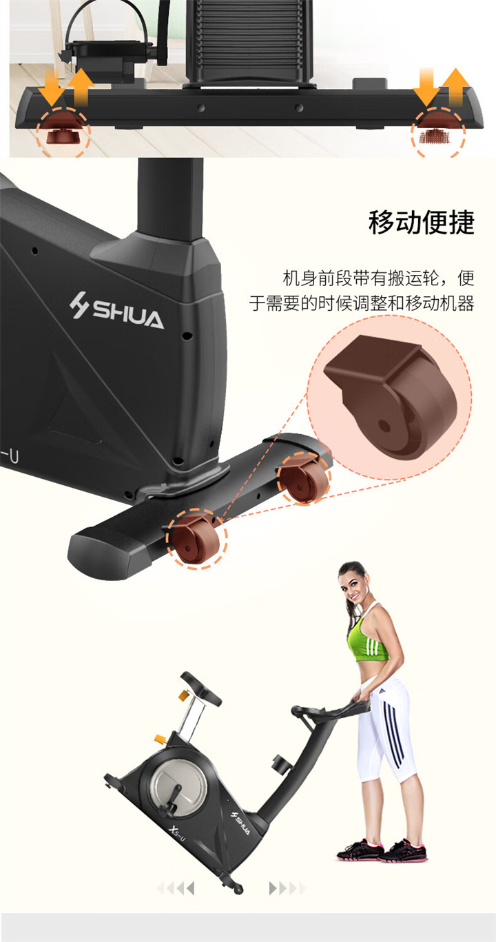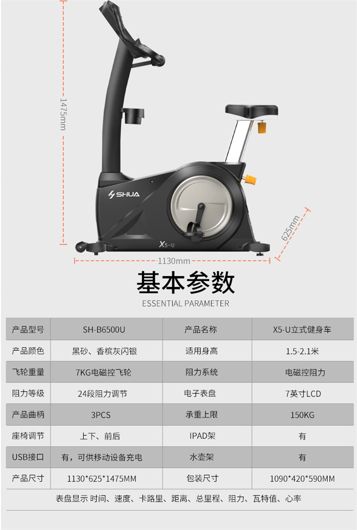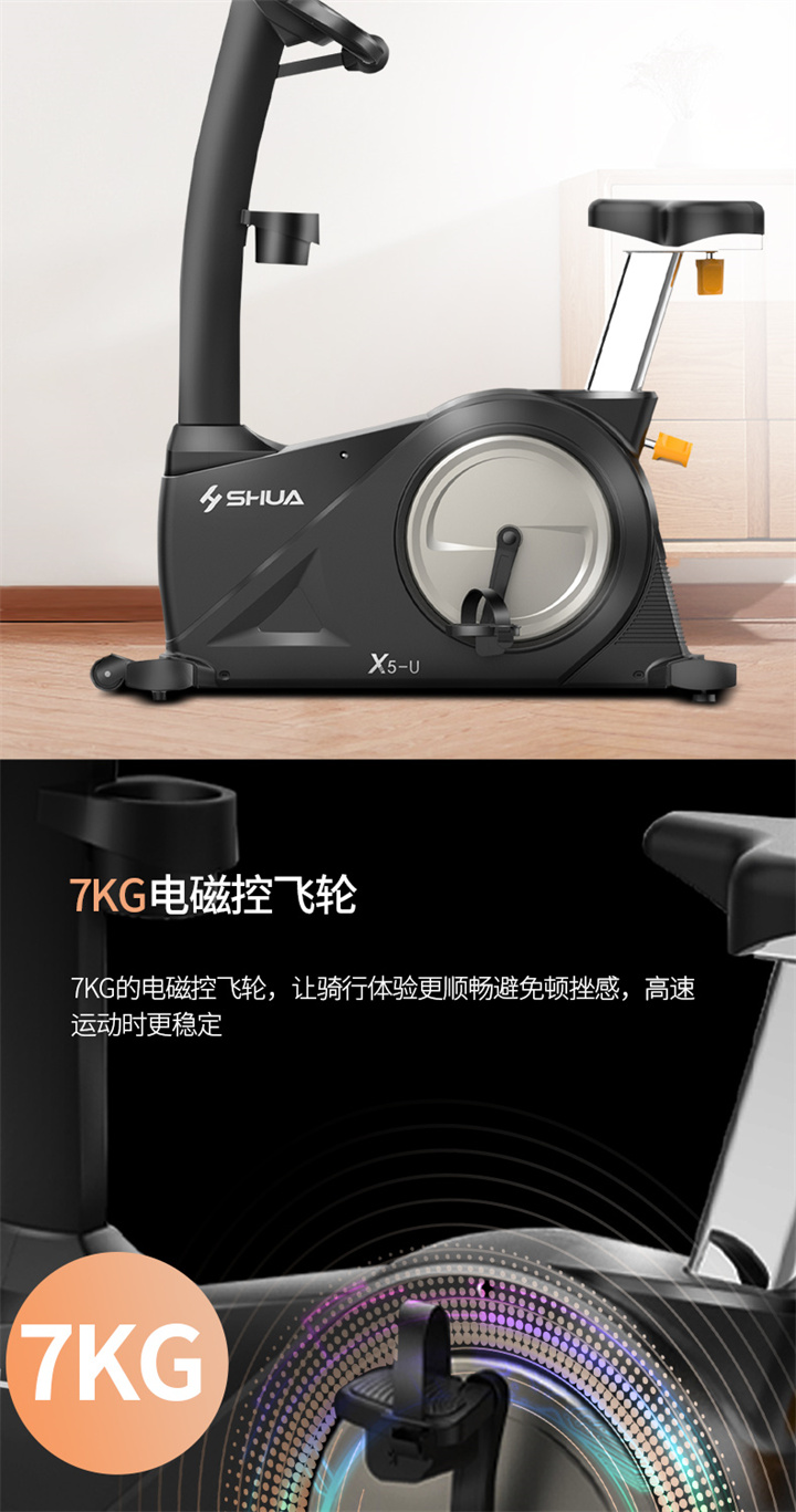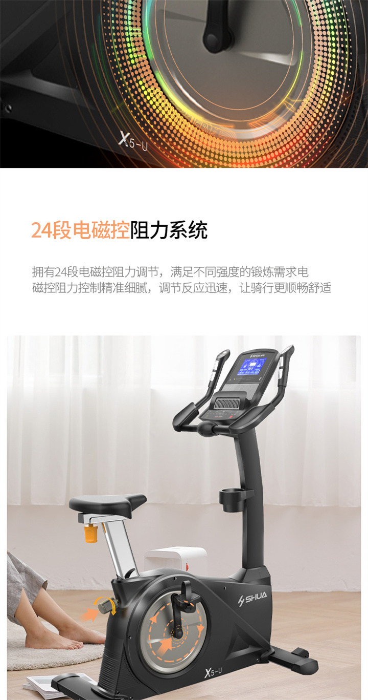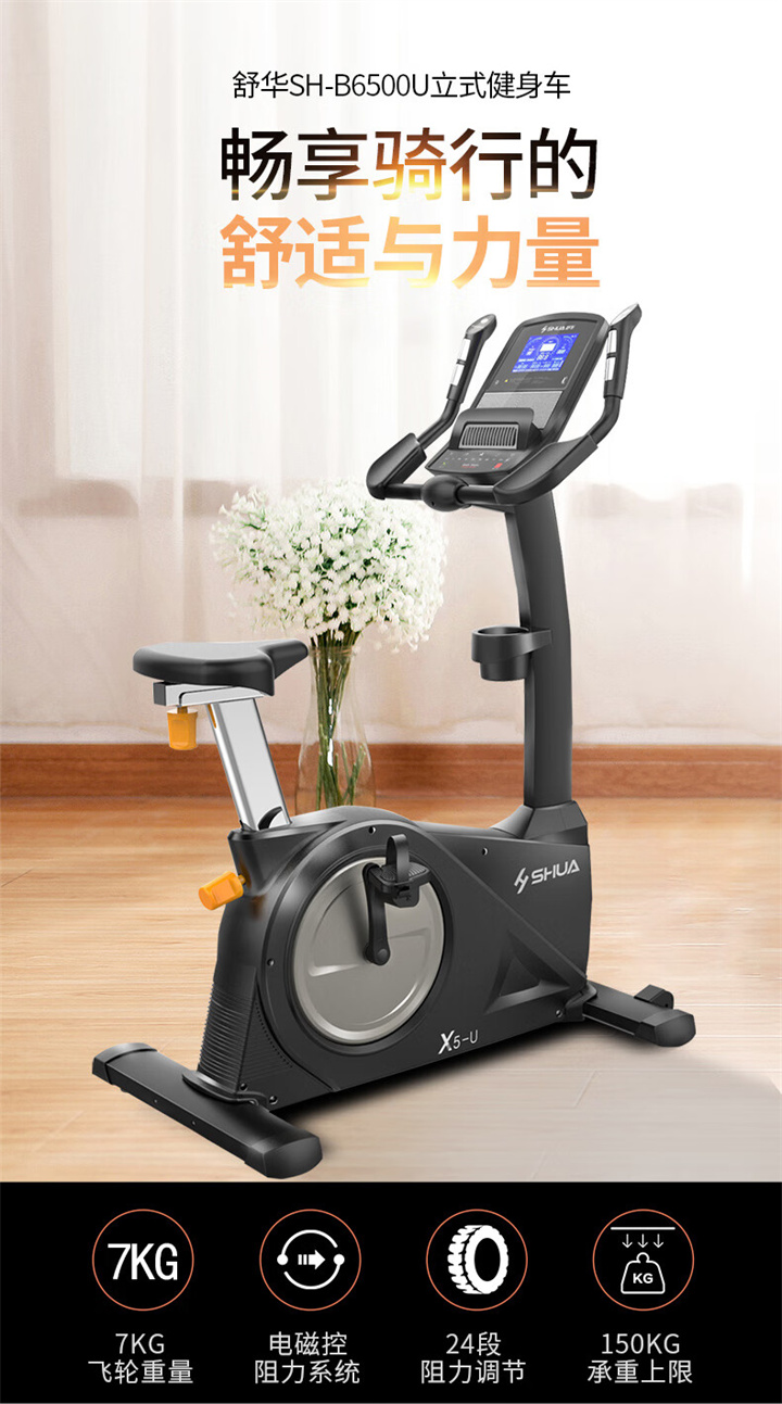 舒华立式健身车SH-6500U(X5-U)采用自发电,曲轴达3PCS,电控的阻力系统,设有24段阻力等级,拥有7.5kg的磁控轮。